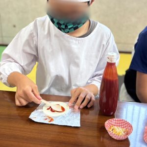 自分たちで餃子の皮にケチャップをぬりソーセージやチーズを乗せて焼きました☺