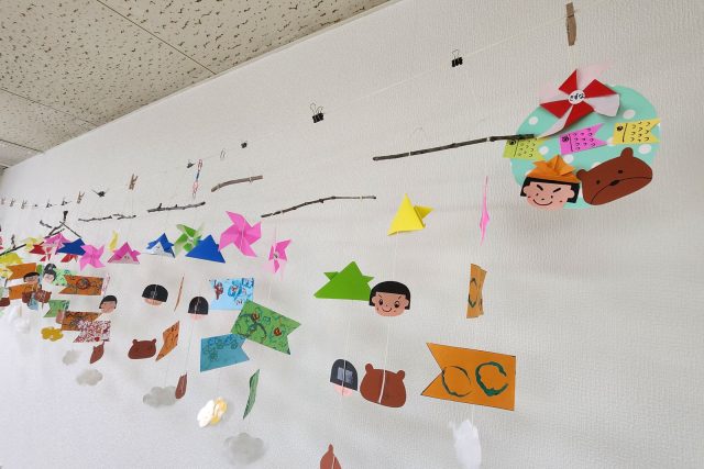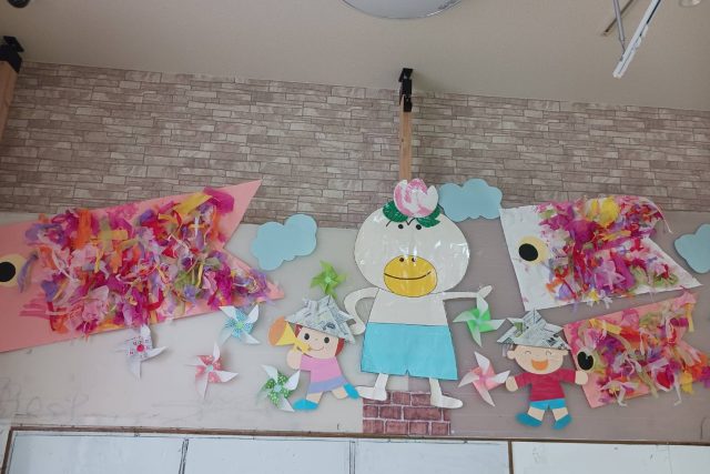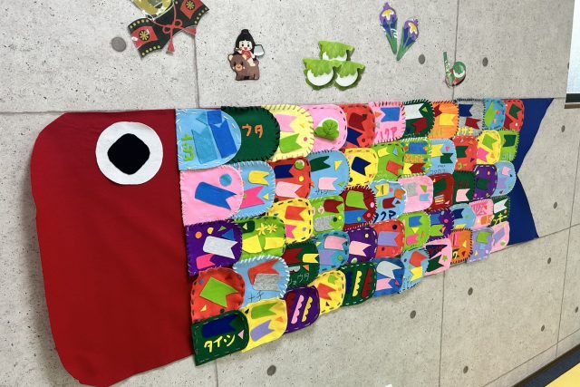 リアンの壁に泳ぐ大きな鯉のぼりに 毛糸とフェルトを使って鱗を作りました🎏 ミニ鯉のぼりを貼ったり名前