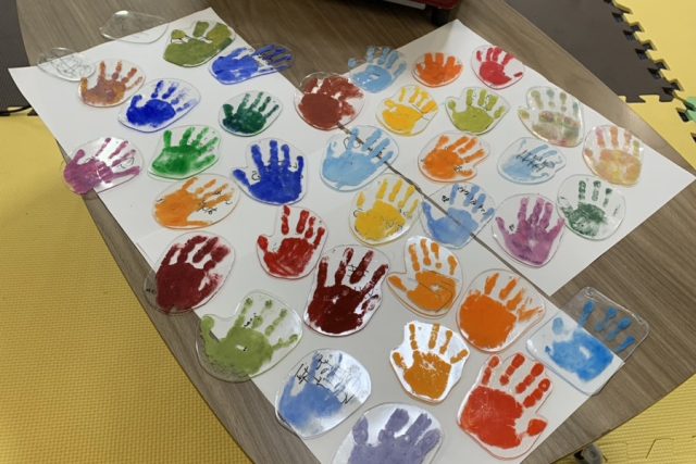 プラバン制作をしました🖌 手のひらに好きな色の絵の具を塗ってプラバンにペタ! 自分で上手に塗る子もい